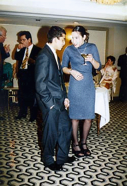 Uchi y Lalo conversando en la recepcion. (Atras:) Amigos de mi papi y mami socializando, y una sen~ora con Kimono. | ||||||||||||||||
